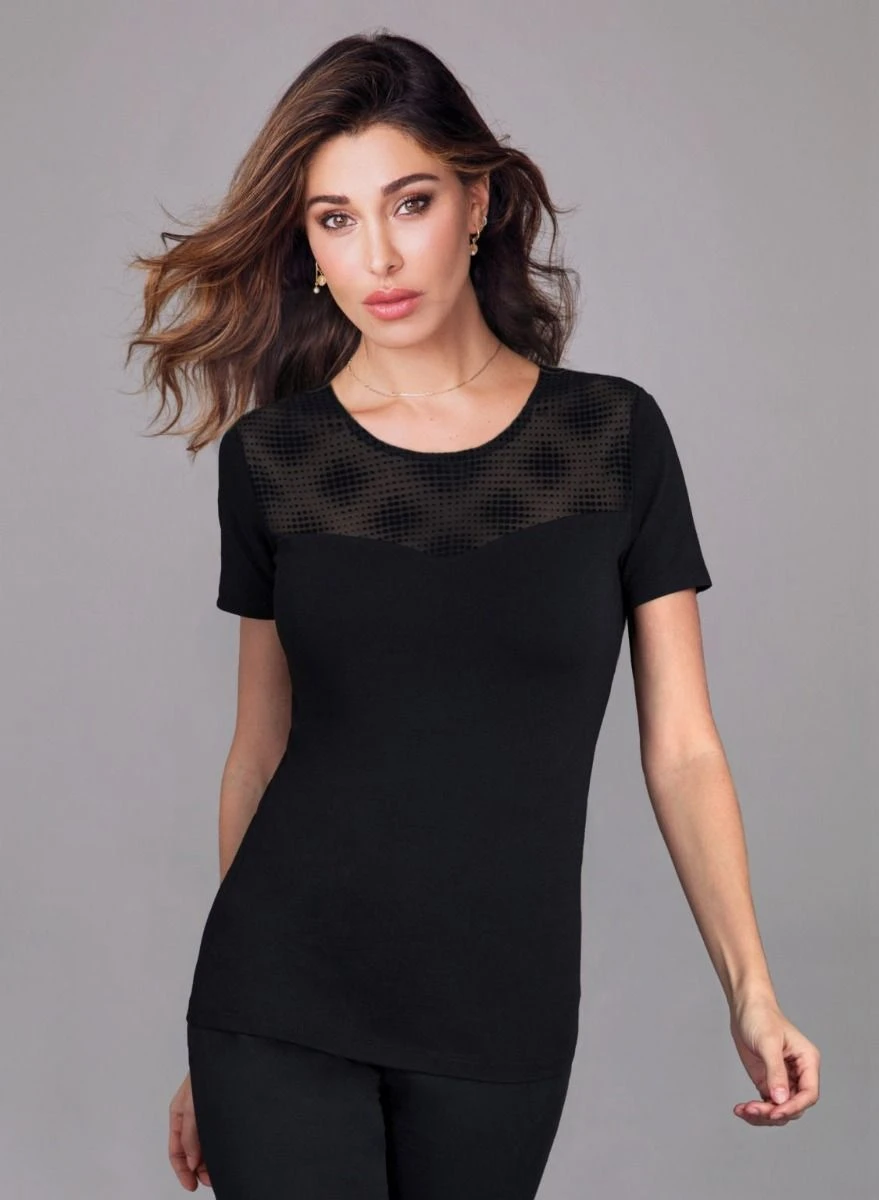 Bellissima Maglia Donna Sottogiacca M/M Jadea 4293 in morbido cotone elasticizzato e raffinato tulle floccato con motivi a pois e scollo a cuore sul davanti